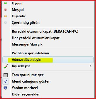 direk buradki bölüme gelmiş oluyosunuz burda değiştirdiğiniz görünen isim msn deki nickiniz oluyor