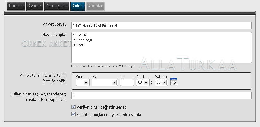 Anket: eger sizde anket paylasmak isterseniz bu secenegi kullanabilirsiniz. (resimde ornek kulanim gosterilmis)